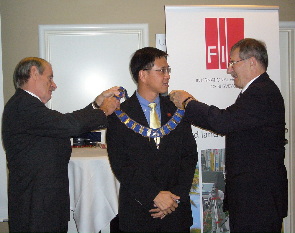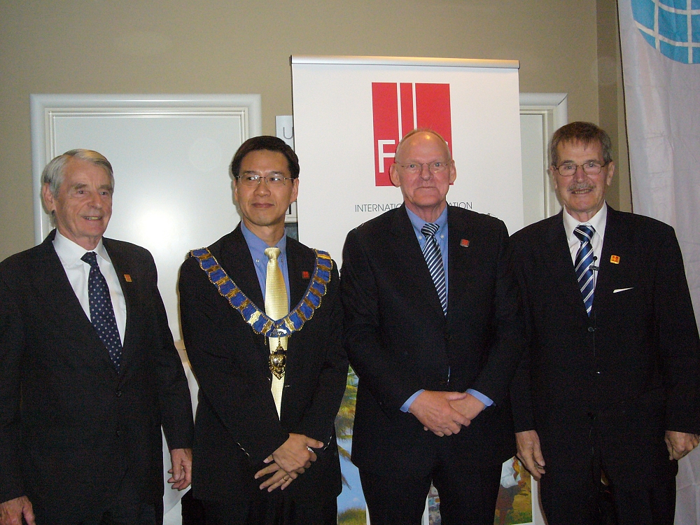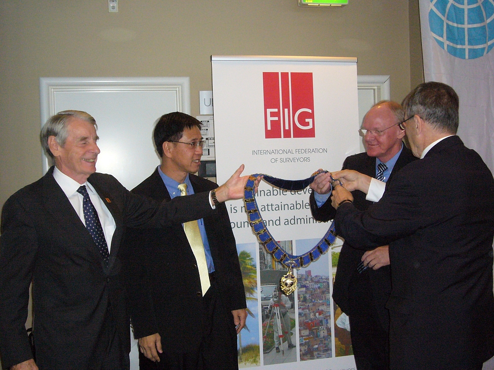 FIG President Stig Enemark (2007-2010) together with the new President CheeHai Teo with the President's chain of office and Honorary Presidents Robert W. Foster and Juha Talvitie that assisted in the ceremony.