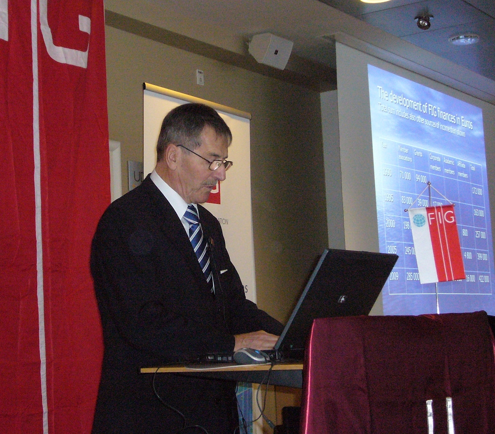 President Stig Enemark making his Farewell Speech on FIG achievements in 2007-2010 at the Handover Ceremony.