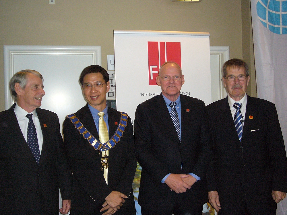 Presidents Stig Enemark and CheeHai Teo at the Handover Ceremony assisted by Robert W. Foster and Juha Talvitie.