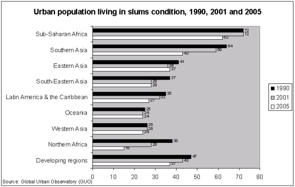 Half of humanity now lives in cities, and by 2050 70 per cent of the world’s people will reside in urban areas. By the middle of the 21st century the total urban population of the developing world will more than double, increasing from 2.3 billion in 2005 to 5.3 billion in 2050. “Urban growth rates are highest in the developing world ..(which is) responsible for 95 per cent of the world’s urban population growth” (UN-HABITAT: 2008). However, many cities will be characterized by urban poverty and inequality, and urban growth will become virtually synonymous with slum formation. Indeed, Asia is already home to more than half of the world’s slum population (581 million), followed by sub-Saharan Africa (199 million), where 90% of new urban settlements are taking the form of slums. As shown in figure 1 (below), at least one third of the urban population in the developing world lives in slum conditions.