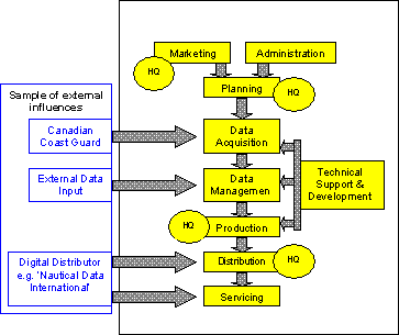 The Canadian Hydrographic Service (CHS) prides itself on its paramount attention to quality. CHS hydrographers and cartographers have long held the banner of ‘quality’ as the ‘flagship of service’. The dramatic revolution in technology, client demands and organizational culture has shaken the historic pillars of quality assurance in CHS. In response, CHS is moving to reinforce this foundation of quality with a new business model anchored by the culture of a Quality Management System. Using the process management model of the ISO 9000 International Standard and performance measurement indicators, CHS proposes to better control production and move toward a philosophy of continuous improvement.