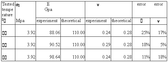 From the experiment data in table 1-3, the error of elastic modulus is 10 to 25  and the error of Poisson’s ratio is 5  to 27 . All the errors are within the civic engineering requirement 30  . The main sources of errors come from the artificial optical parallax of the measurement of Young’s fringes, the thermostatic setup of the temperature-controlled box, the instrumental error of the specimen fix-up, and the motion error of the rigid body of counter weights. In order to get more precise results, prevent sample-rotation prevention and well temperature control are necessary in experiment.