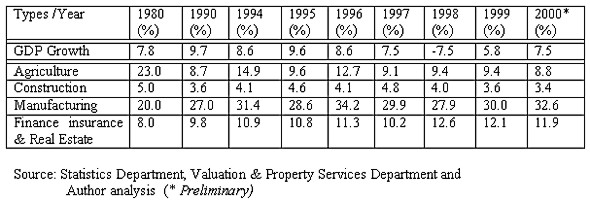 In understanding the need for property management, it would be relevant to look at Malaysian economy indicator and the place of property in its economy. Before the outbreak of the Asian financial crisis in mid-1997, Malaysia experiences rapid economic growth and property sector plays a significant role in this growth. Table 1 below indicates that the Malaysian economy has performed above 7.0% with the exception for 1998. Malaysia has moved from an agro-based economy before the 1980s to manufacturing and services orientated in 1990s. Manufacturing, and finance insurance and real estate respectively contributed 30.0% and 12.1% of the economy in 1999 compared to 20.0% and 8.0% in 1980, whilst agriculture decreased from 23.0% in 1980 to 5.8% in 1999.
