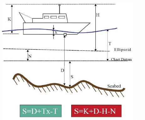 3) Note that the height of the antenna above the transducer, K, and the depth of water below the transducer, D, must both be corrected to vertical distances on the boat common reference system, installation offsets and lever arm corrections.